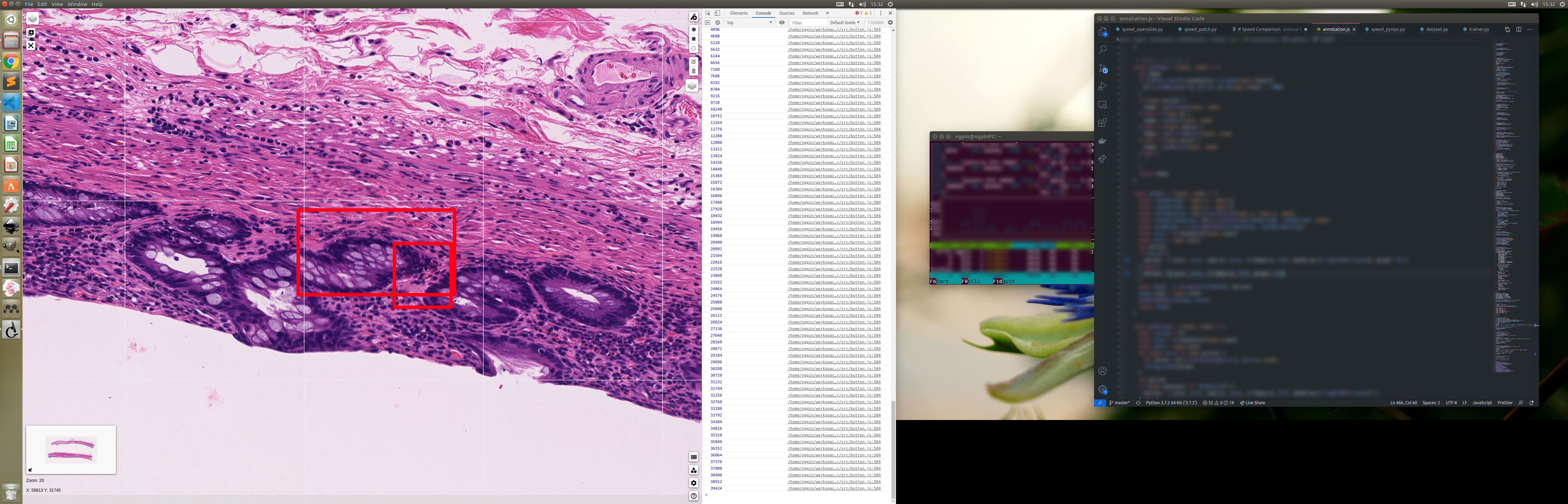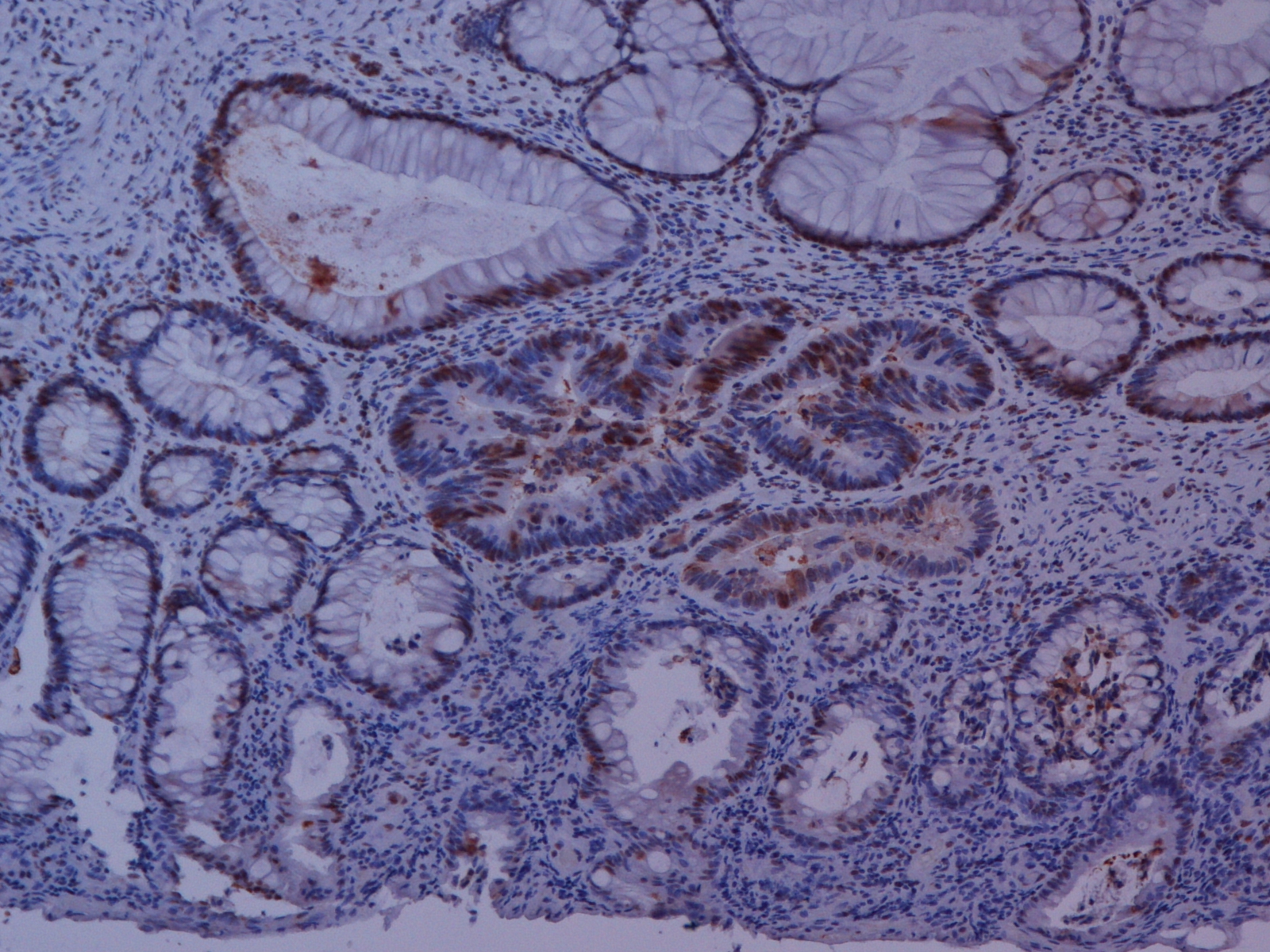 上でも書いたとおり潰瘍性大腸炎の患者さんでは長年粘膜が炎症にさらされることにより粘膜に遺伝子変異がおき、それを背景として前癌病変や癌が発生してくることが知られています(炎症性発癌)。このタイプの癌は、通常の発癌経路と異なり多発的に生じてくるため、大腸全摘が標準的な治療とされています。通常の大腸癌と炎症性発癌を区別することは治療方針を決定するために重要ですが、人間の目による病理診断では背景粘膜の炎症の存在も相まって、しばしば鑑別が困難です。従来はp53蛋白の免疫染色を用いてp53遺伝子の変異を検出し、鑑別の参考としていました。当科では、次世代病理情報連携学講座と共同で人工知能(AI)に病理画像を学習させることで、p53免疫染色を行わないでも発癌経路の鑑別ができる診断支援ツールの構築を目的とした研究も行っています。