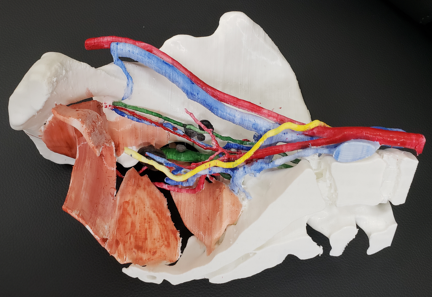 また特に直腸癌においては狭い骨に囲まれた空間に精嚢や前立腺、尿管などの重要な臓器、重要な血管が多数あり、これらを傷つけないように手術を行う必要がありますが、血管の走り方や分枝形態が複雑で個人差が大きく、これを術前に把握しておくことがより大切になってきます。画面上のシミュレーションだけではなかなか複雑な解剖を把握することが難しいですが、術前にこういった臓器解剖を3Dプリンターで作成し、直接これを手にとって見ながら手術のシミュレーションを行うことで、手術の精度を高めることが可能です。また解剖に関する知識の乏しい学生や若手医師の教育にも非常に有用であることがわかっています。