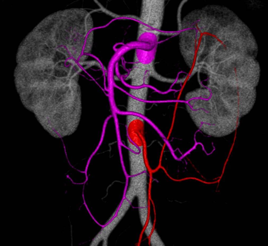 大腸を切除するためには大腸を栄養する動脈や静脈を切る必要があります。おおまかな血管の走行は皆同じですが、細かい分枝形態などはかなり個人差があります。近年大腸手術に対し腹腔鏡やロボットといった低侵襲手術で行う機会が多くなってきましたが、これらの手術は開腹手術と異なり狭い視野での手術となるため、切る必要のない血管を誤って損傷することがないよう、術前に血管解剖を理解しておくことが大切です。CT技術の進歩により、腸間膜の細い動脈も三次元構築することが可能となりました。当科で過去手術を受けた多くの患者さんのこういった血管分枝のバリエーションを3Dで細かく調べることで、より安全に手術を行う研究をしています。