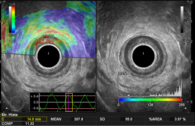 直腸手術では、残存する直腸が小さくなることや自律神経への影響から、一定の頻度で手術後に排便(便回数の増加、便漏れ)、排尿(頻回の尿、排尿困難)、性機能(勃起不全、射精障害)などの骨盤機能に障害をきたすことがあり、これをどう回避するのかが重要な課題です。当科では治療前後に肛門機能検査・肛門エコー検査、排便・排尿・性機能に関するアンケート調査を行い、骨盤機能障害の軽減・早期発見・治療に努めています。また超音波を用いて組織に侵襲を加えることなく肛門括約筋の硬さを調べる手法(エラストグラフィー)を確立し、これを用いて治療が及ぼす括約筋への影響を評価することを目指しています。