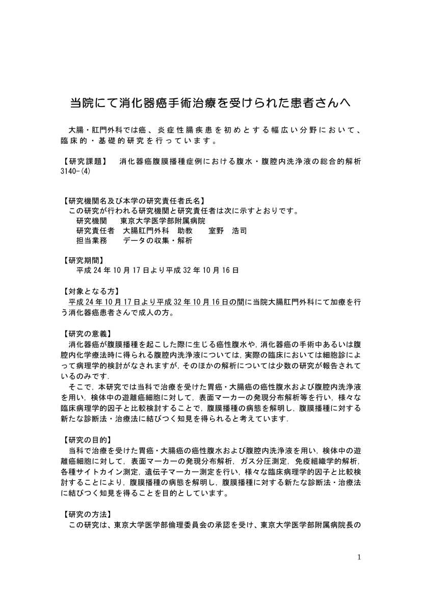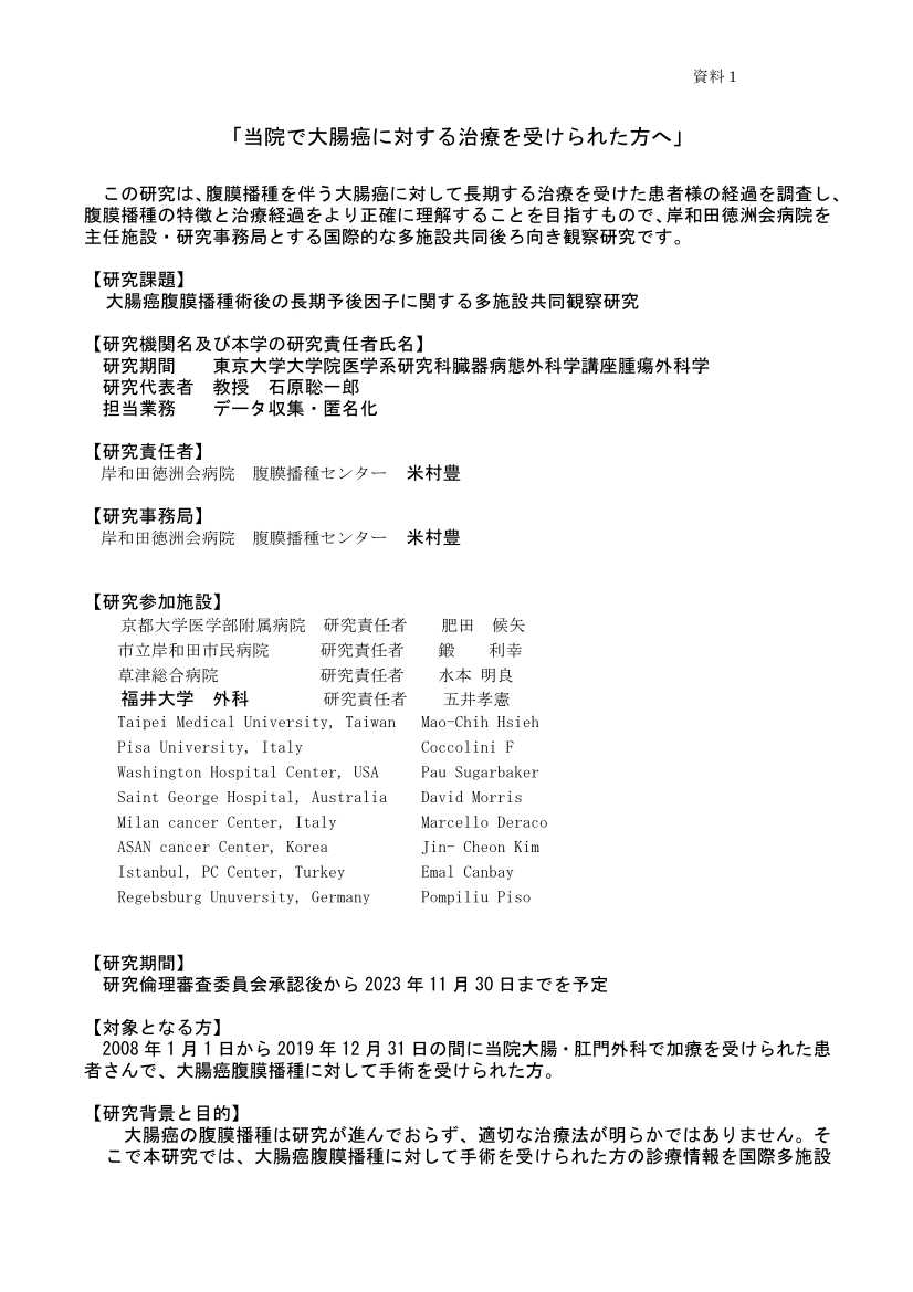 ・大腸癌腹膜播種の客観的評価方法に関する多施設共同前向き観察研究(多施設共同研究)