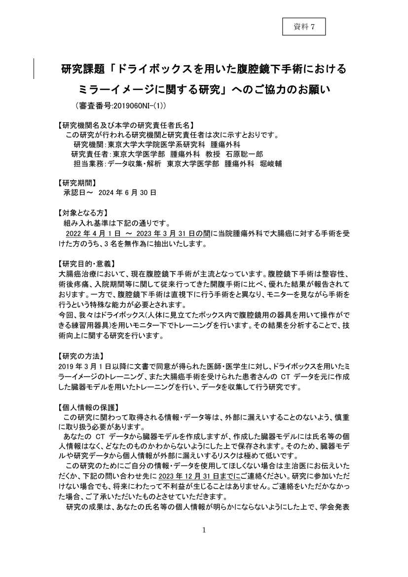 ・ドライボックスを用いた腹腔鏡下手術におけるミラーイメージに関する研究 [倫理委員会番号2019060NI-(1)]